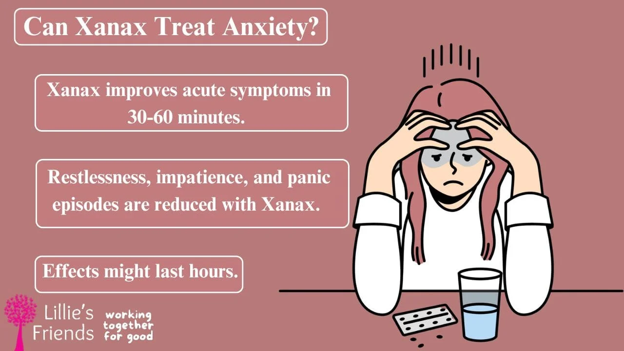 Xanax may be useful in treating anxiety symptoms rapidly and acutely. It aids in easing anxiety, restlessness, irritability, and panic attack symptoms. It lessens the intensity of symptoms and improves the person’s ability to go about their everyday life when taken as directed and well tolerated.
