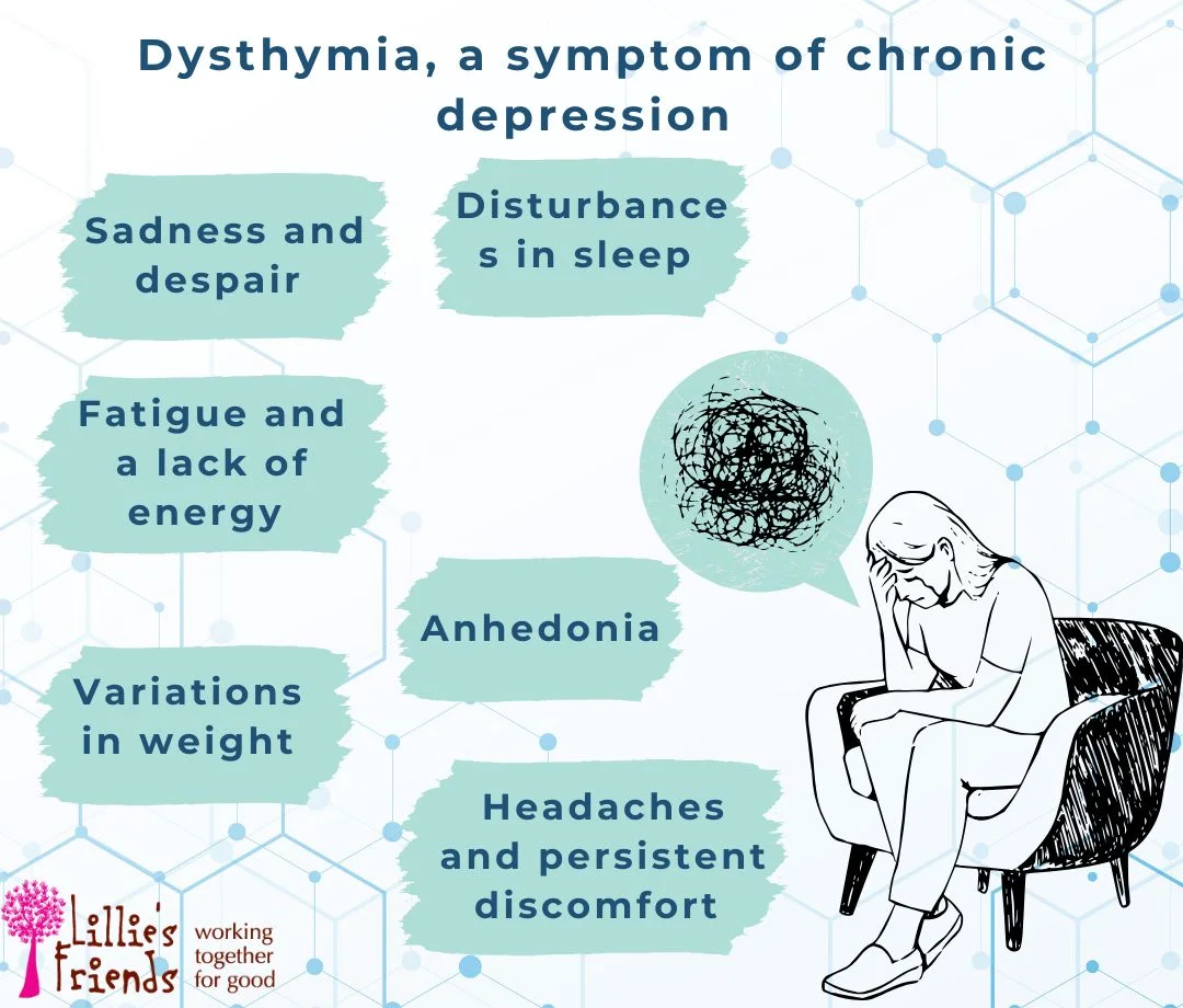A patient must experience symptoms for at least two years and not go more than two months without experiencing any symptoms to be diagnosed with dysthymic disorder . The symptoms of this type of depression are the only ones that last for so long. The disease typically manifests early in life. In contrast to major depressive disorder, the patients often have milder symptoms. Even yet, the illness has the potential to seriously impair a person’s relationships , employment, and spare time.