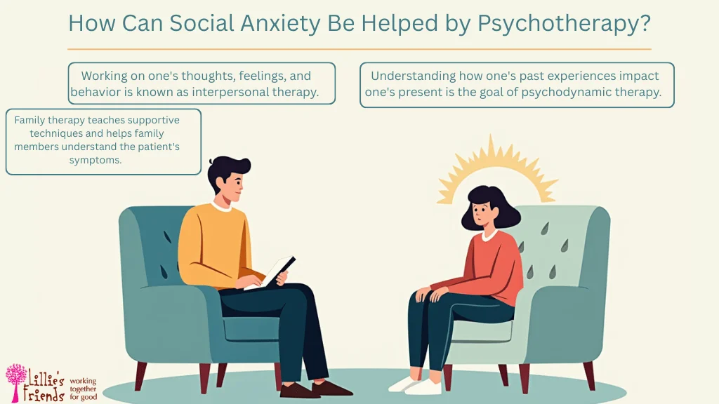 The goal of psychotherapy is to assist the patient in recognizing and altering their emotions, ideas, and behaviors. Individual or group treatment sessions are available for patients. Through psychotherapy, they learn more efficient coping mechanisms for the symptoms. It could include studying stress management or relaxation methods for social anxiety.
